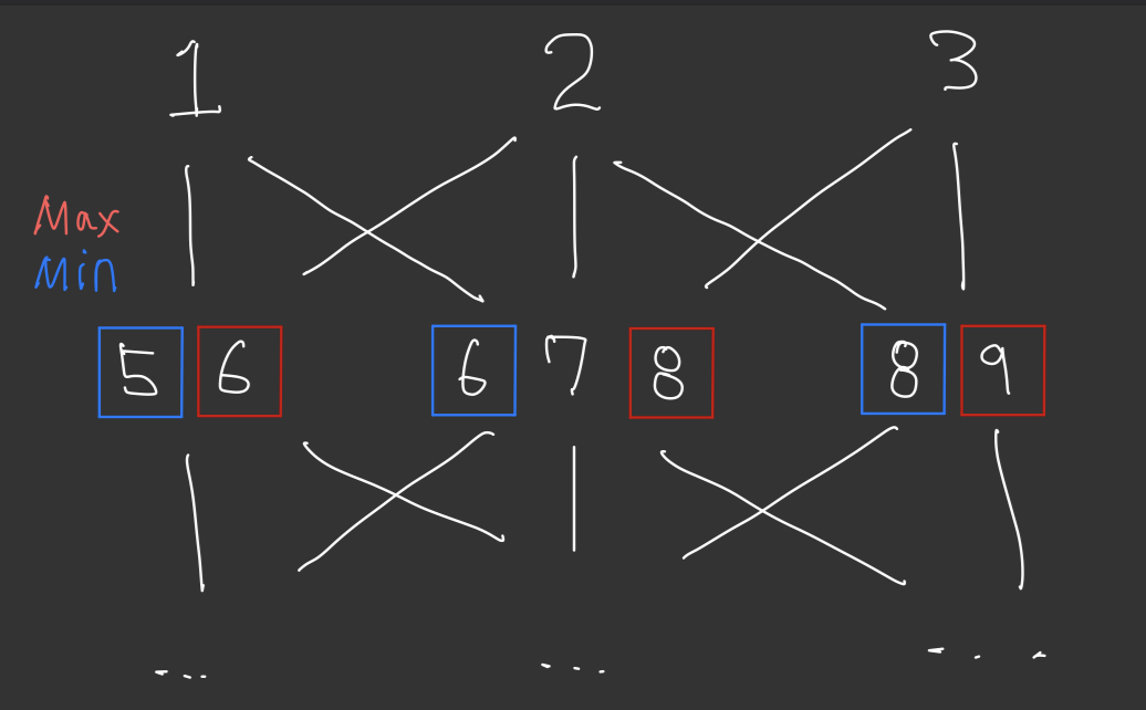 arr[i][j] 값을 구하기 위해서 이전 값들의 최소값과 최댓값이 필요하기 때문에