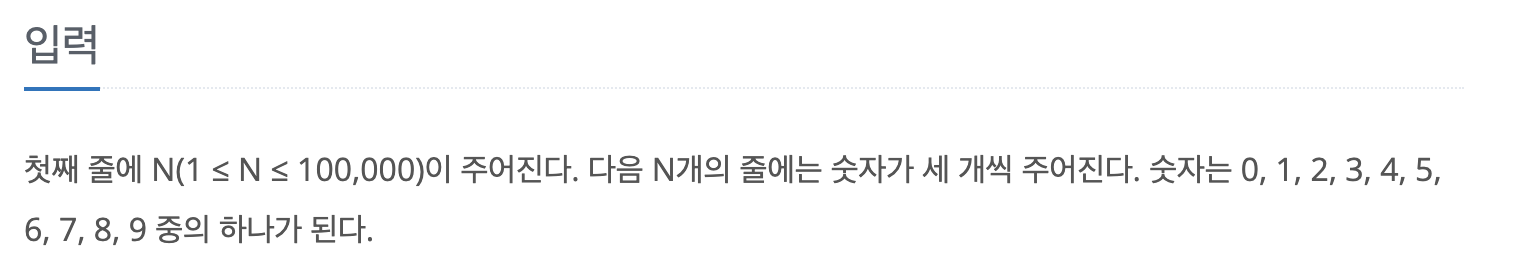 첫째 줄에 N(1 ≤ N ≤ 100,000)이 주어진다. 다음 N개의 줄에는 숫자가 세 개씩 주어진다. 숫자는 0, 1, 2, 3, 4, 5, 6, 7, 8, 9 중의 하나가 된다.